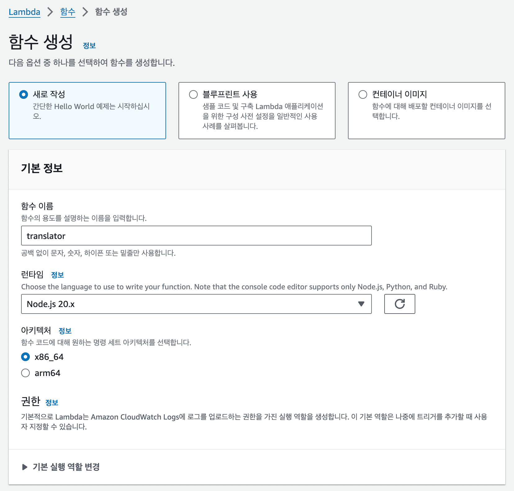 AWS 콘솔에서 Lambda를 통해 들어간 후 함수 생성을 클릭하면 다음과 같은 페이지가 나온다. 람다의 이름을 입력해준다.