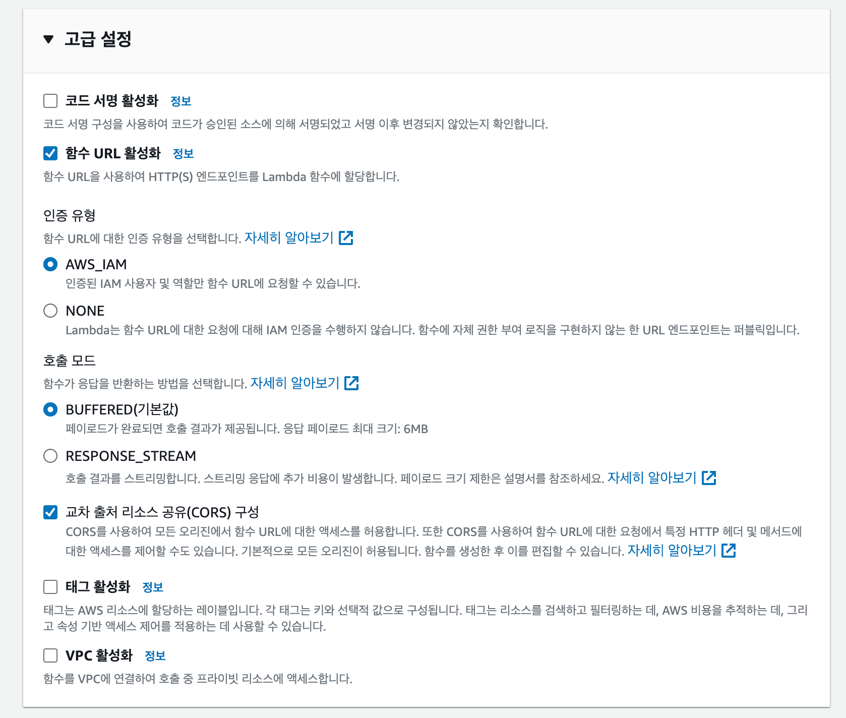 클라이언트에서 Lambda에 요청을 보내기 위해서는 당연하게도 URL이 필요하다. 일반적으로는 AWS API Gateway를 통해 REST API를 관리하는 경우가 많지만 우리가 사용할 익스텐션의 경우 함수 하나만을 실행하는 것이 전부이니 Lambda Function URL을 통해 간단하게 엔드포인트를 만들어주자.