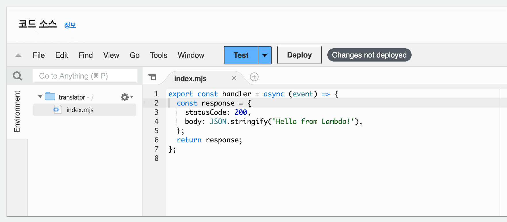 함수를 생성하면 Node.js 기준으로 위와 같은 화면이 나온다. 우리는 이제 람다 내부에서 DeepL 요청을 보내는 로직을 작성하면 된다.