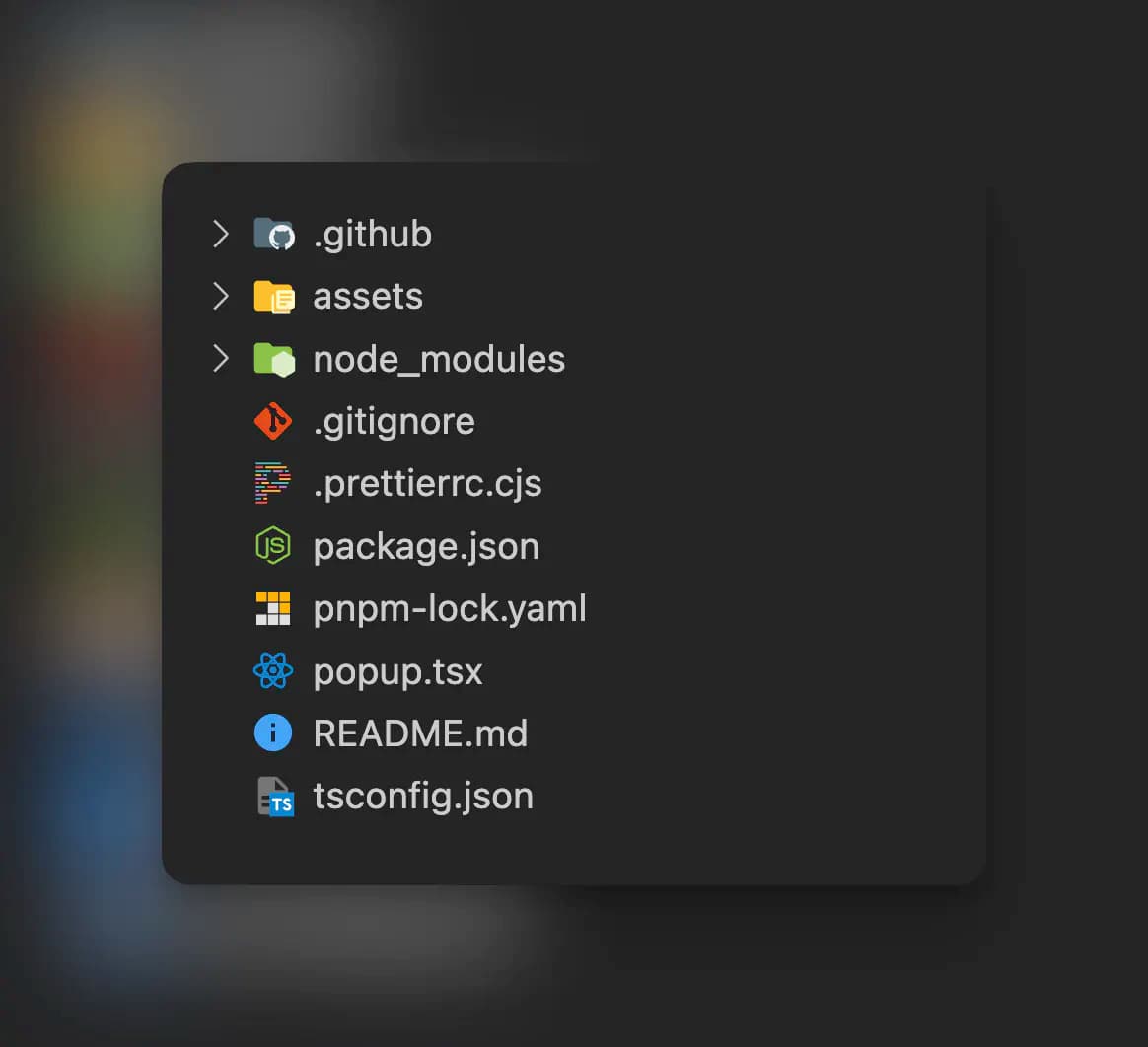만약 자막 번역의 작동 여부를 설정하고 싶다면 Option 페이지나 Popup을 이용할 수 있다. 이번엔 팝업을 통해 자막 번역의 작동 유무를 설정해보자. 우선 기존에 프로젝트를 설정하면서 루트 폴더에 popup.tsx가 생긴 것을 알 수 있다. popup.tsx의 기본적인 요소는 리액트와 같다.