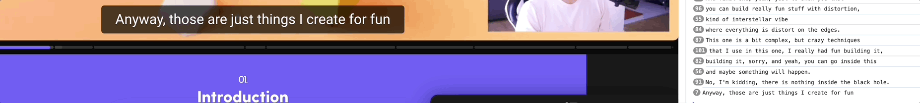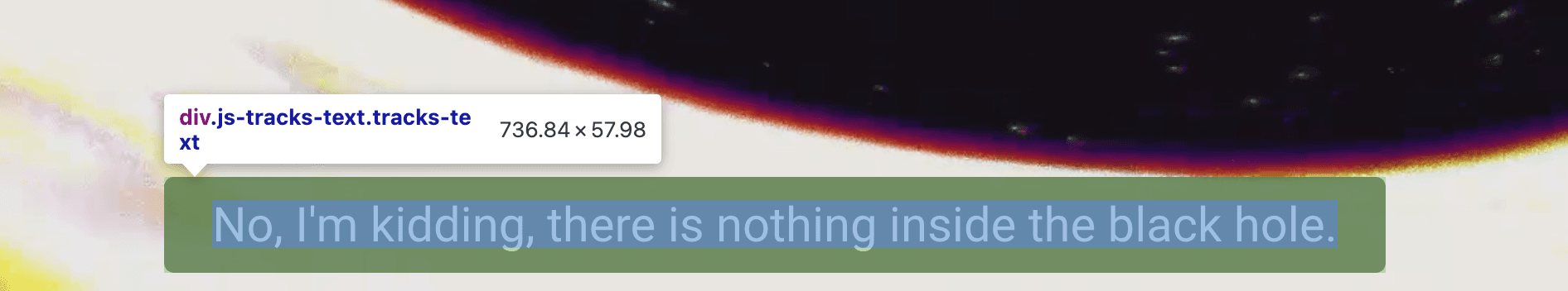 이제 실제 우리가 번역을 하고 싶은 텍스트를 찾아내야한다. three.js journey의 경우 자막을 나타내는 DOM의 선택자가 위와 같다는 것을 알 수 있다.